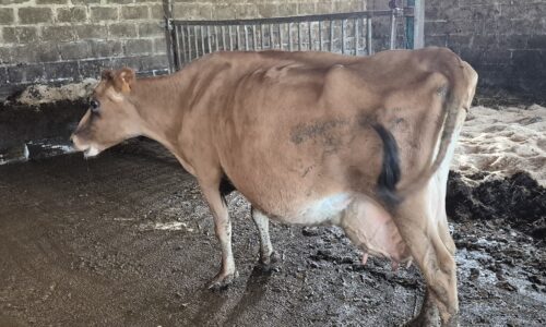 A vendre vache Jersey inscrite née le 04/02/2021 de Steve x une importée du Danemark. Vélée le 251224 et inséminée de BBG Elk 234 en juillet 2025. Confirmée pleine. Traite en salle de traite puis robot. Convertie en nourrice,