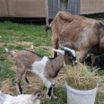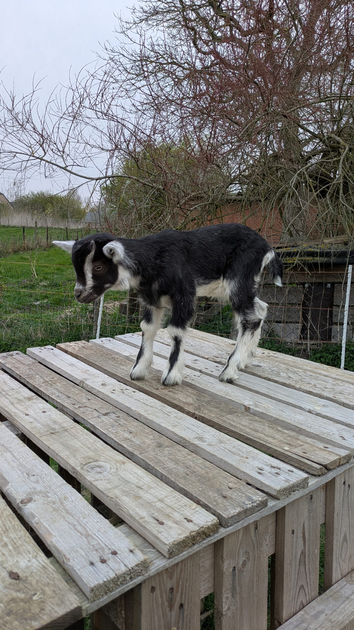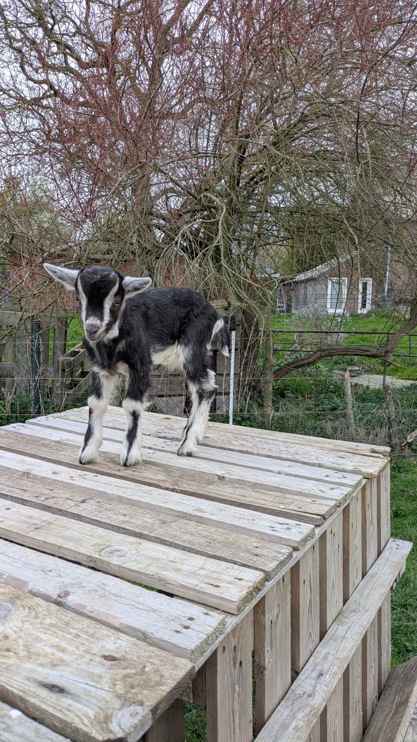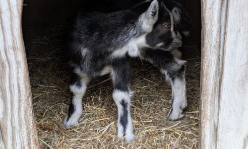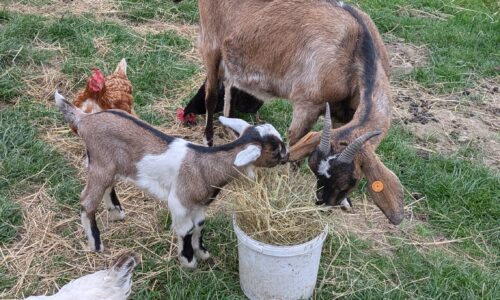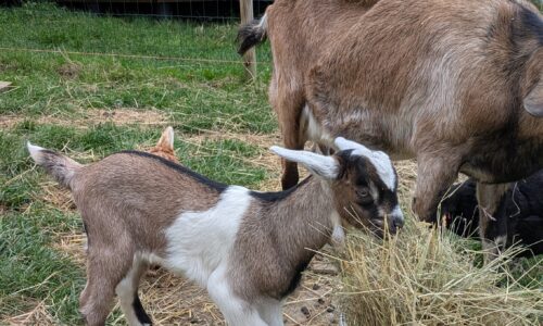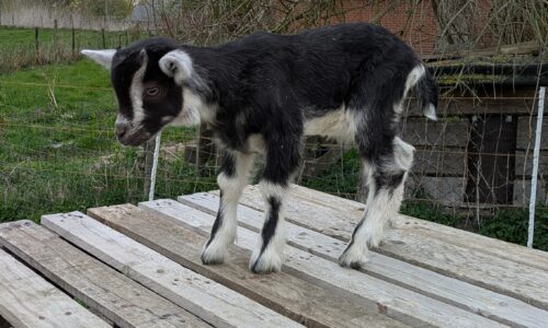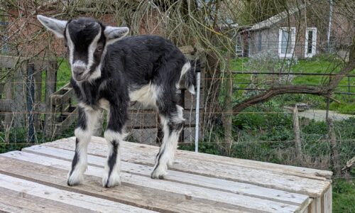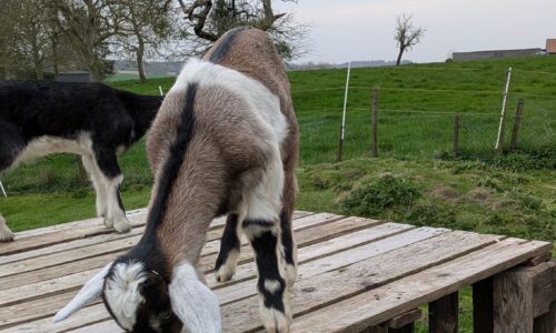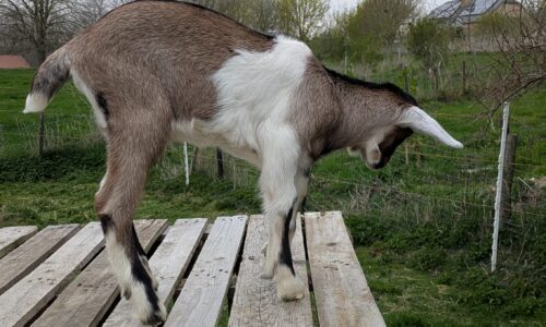Chevreau de race laitière né mi-mars et élevé sous la mère. Soit le foncé (croisé saanen-poitevine) soit le tacheté (croisé saanen-poitevine-anglonubien).
