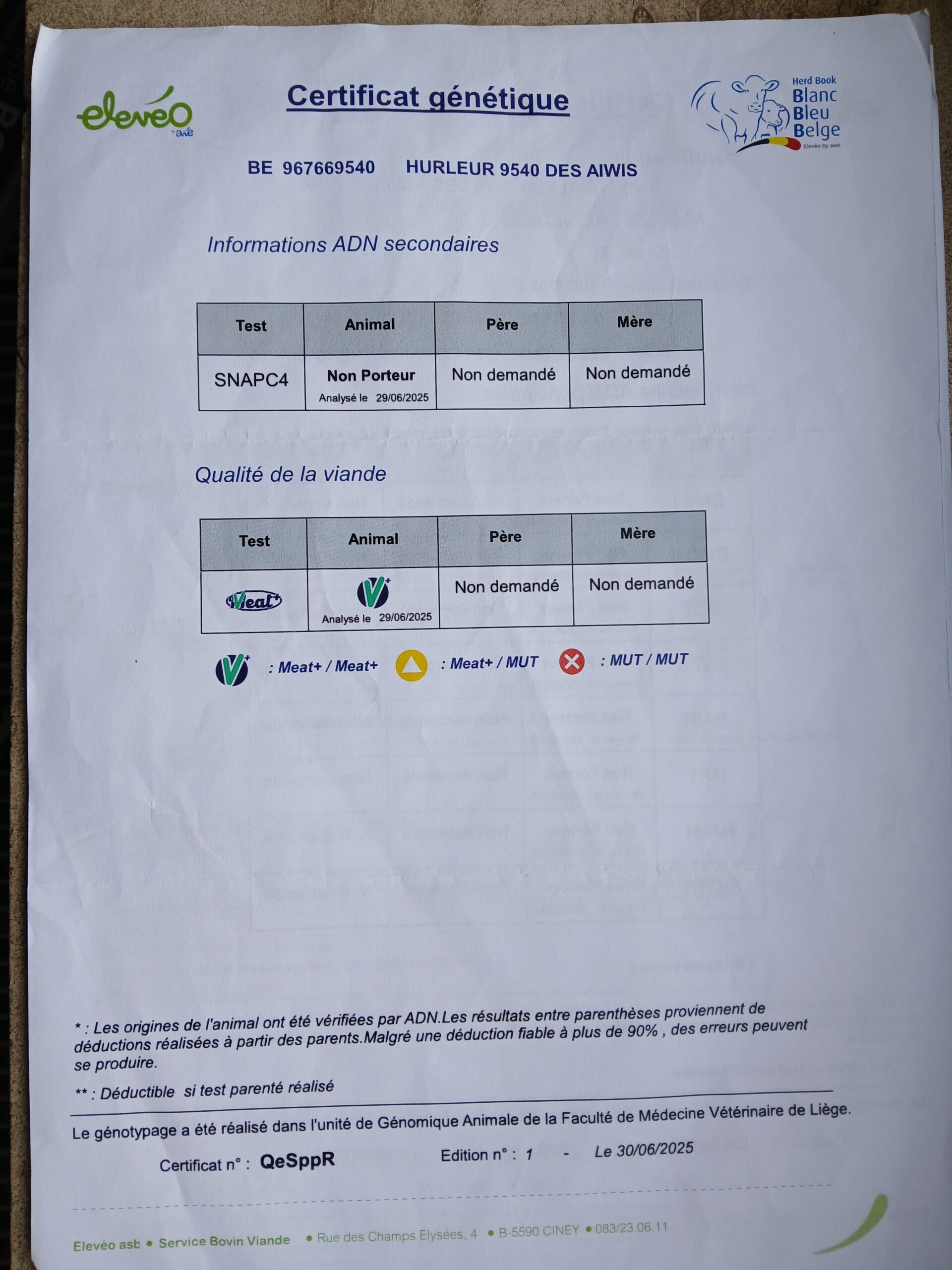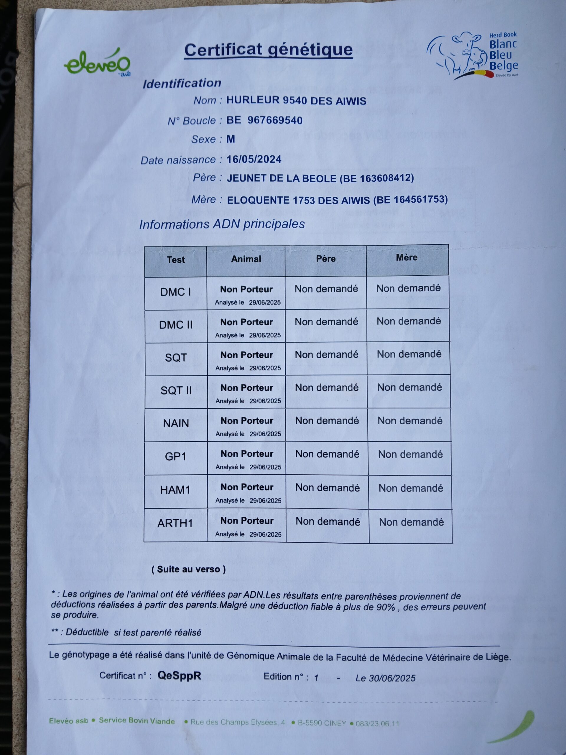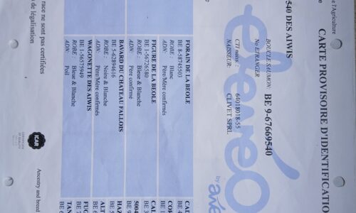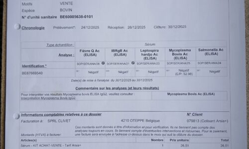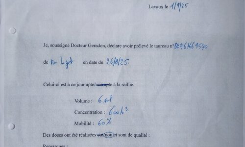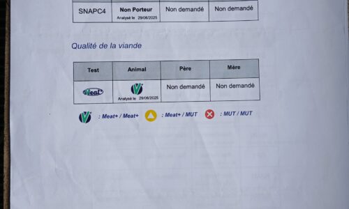 Taureau de saillie BBB de 20 mois. Qualité du sperme testée, indemne de toutes les tares et négatif pour toutes les maladies du kit vente de l’ARSIA. (Voir documents annexes)