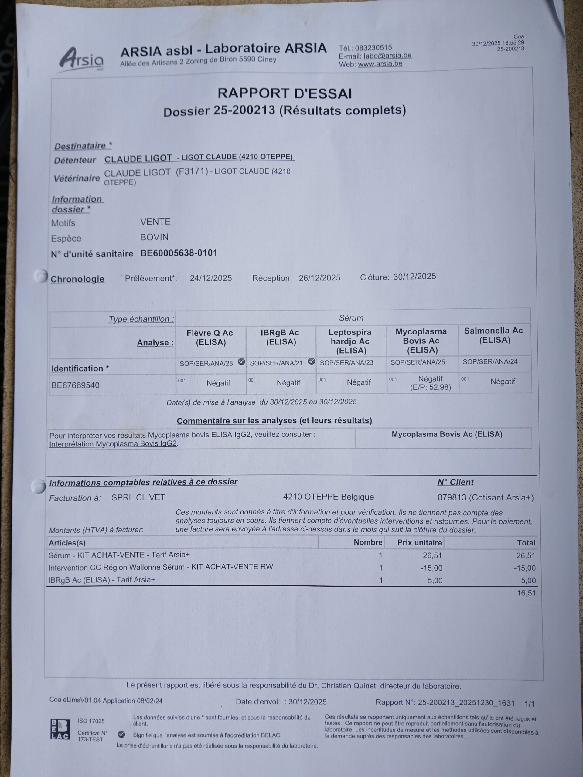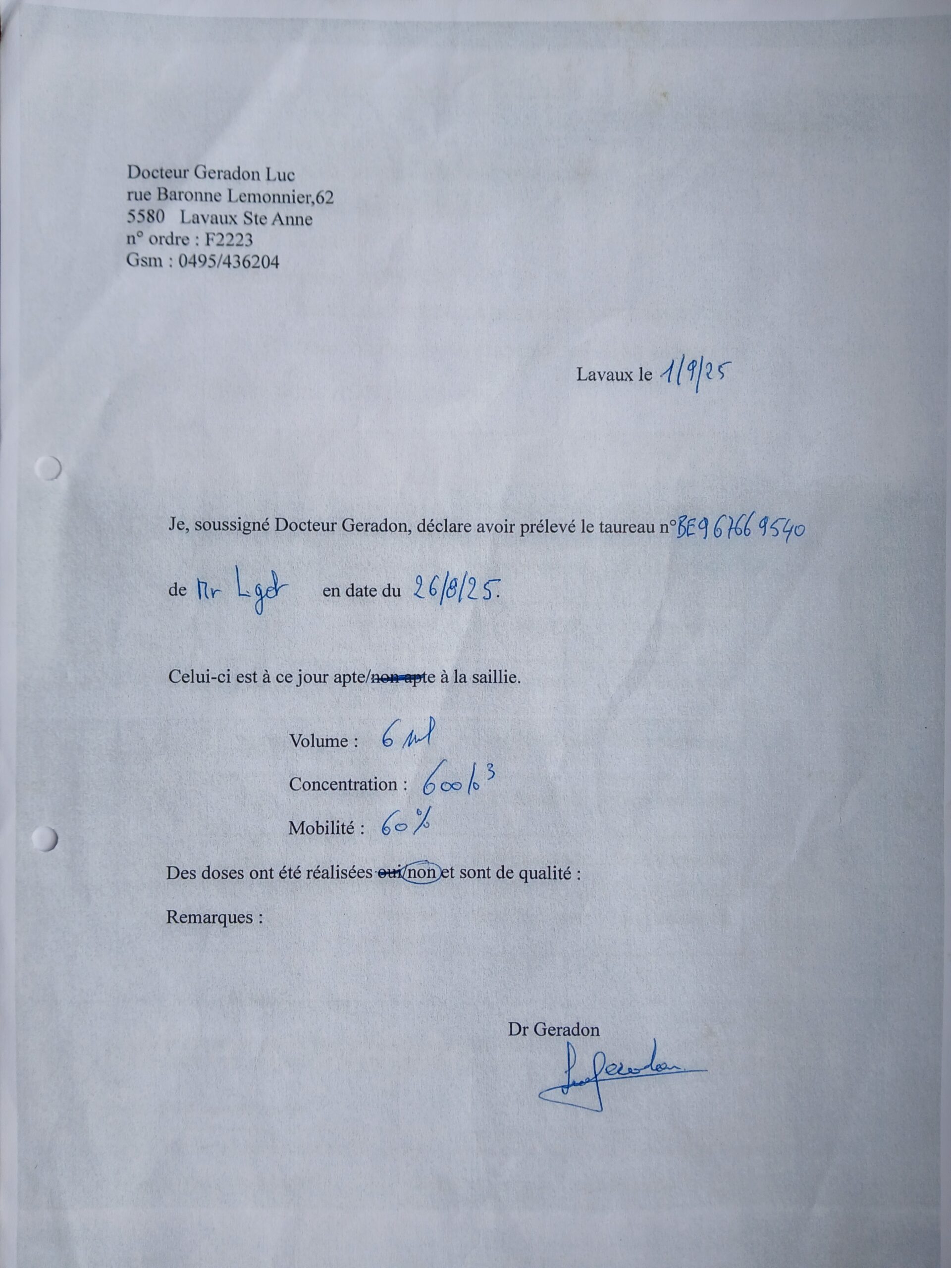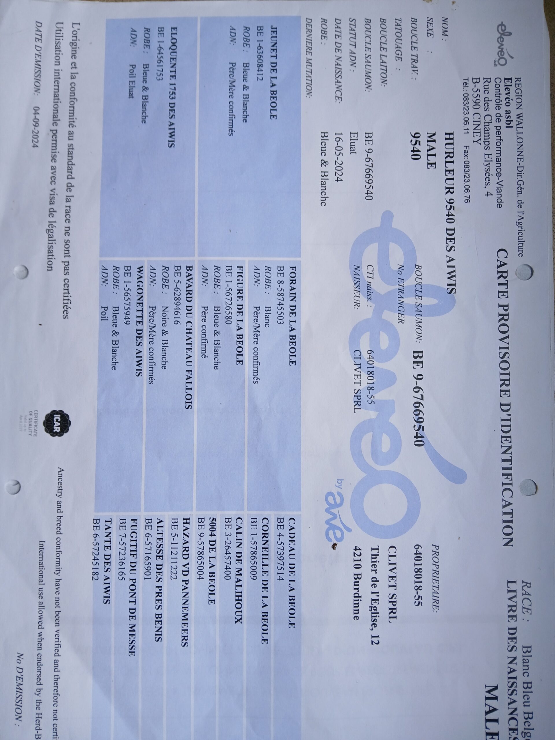 Taureau de saillie BBB de 20 mois. Qualité du sperme testée, indemne de toutes les tares et négatif pour toutes les maladies du kit vente de l’ARSIA. (Voir documents annexes)