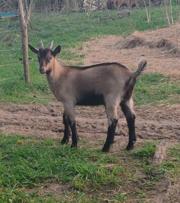 Jeune bouc croisé Alpin × Poitevin à vendre, issu de lignées laitières. Né le 26/02/2026.Bonne génétique...